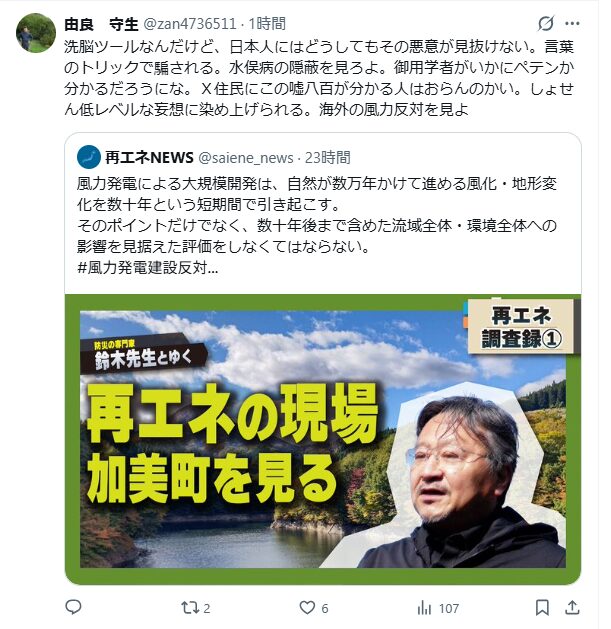 御用学者を動員して、誰にも分からぬグラフを見せて、風力発電の専門家ですと紹介される。水俣病でも、福島の原発被害でも、答えは当に分かっているのにね。政府、権威主義が覆い尽くす。「オマエラ何言っている」そう私は罵られる。それでその反対運動はイカサマだと分かる。参加者はどこにでもある烏合の衆だ。汚い連中よ。一旦被害地になると、すべての人が家畜化される。服従支配だ。なぜ誰も反抗できぬか。
