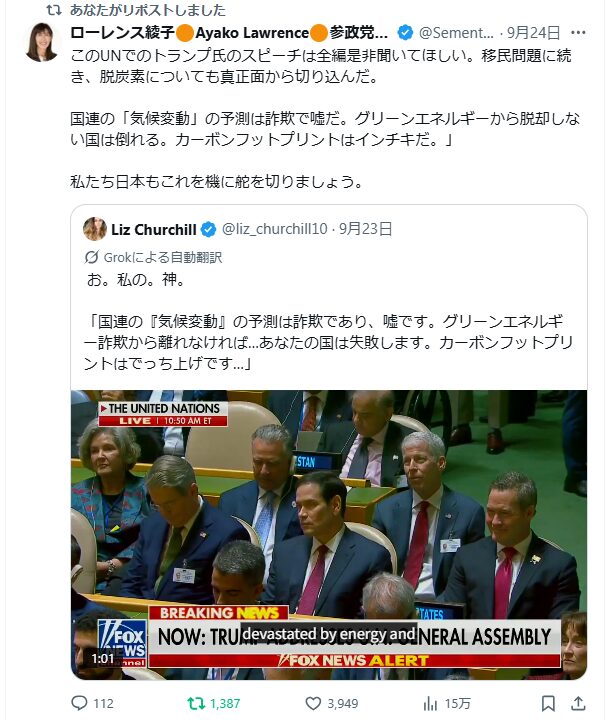 国連でのトランプの演説と、日本の石破との差を、これでもか、と見せられた。日本のテレビや新聞では、絶対に伝えませんな。もう一つ、イスラエルのネタニヤフの演説も、皆が、さっさと退場する風景が話題になる。国連もなかなかやるじゃないか。石破の場合、初めから観客なし、だから、説明の必要はない。テーブルを叩いて熱演したと書いてある。動画を見ていたら、お可哀そうに、と苦笑するしかない。