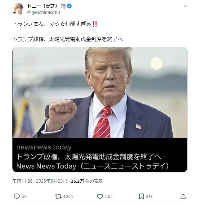アメリカでは風力発電の建設を禁止した。メガソーラーも補助金を禁止する。風力もパネルもいらない。随分と前からアメリカで主張されてきた話だ。バイデンの地球環境運動は完全に否定された。左派・グローバリズム、と言われる人が反トランプで荒れているという。日本でもトランプ嫌い、はいるからね。テレビのワイドショーでは、堂々と「これまで積み上げてきた地球温暖化政策をどうするのよ」と言っている。