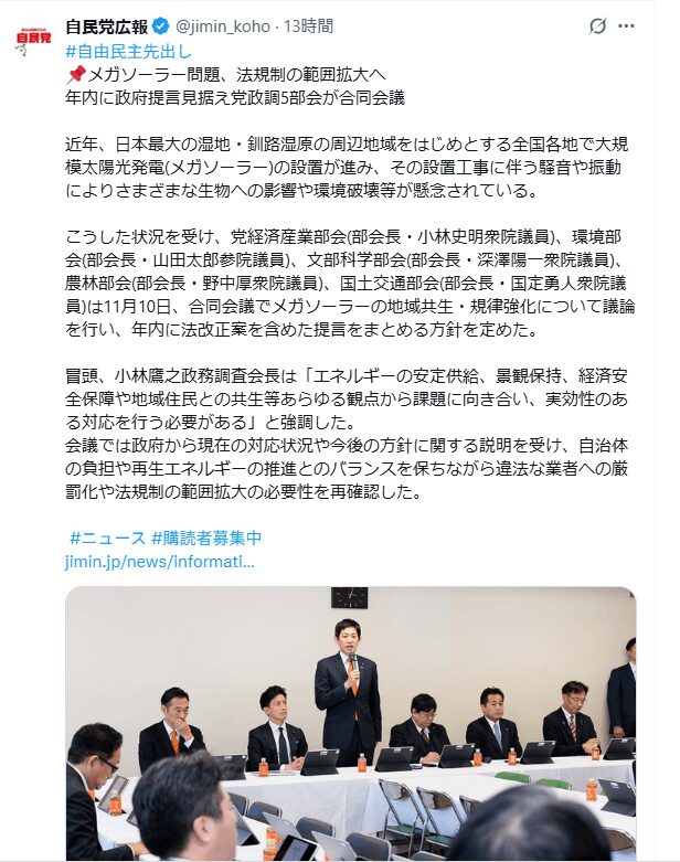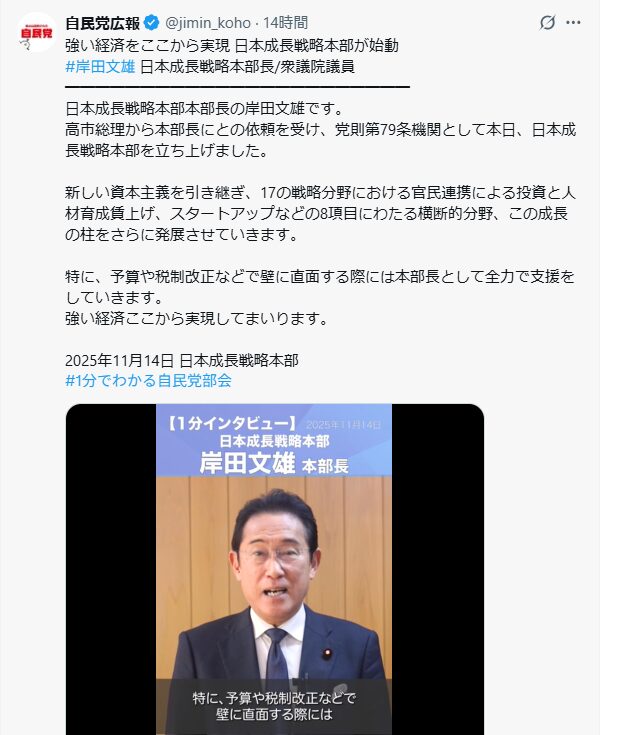 キシダ元総理が自民公報で発信している。高市新総理も再エネ推進だ。移民もドンドンと増やしていく。支配の酷さよ。国会の演説を聞いたらビックリするで。町会議員も酷いけど、国会議員でもそれは同じで、ここまで低レベルな人が政治をやるか、と終末を見るのだ。昔から国会論戦は面白かったけどな、政治家の「らしさ」が際立っていた。昔はよかった、と思うかな。いや、私が年取ったから、彼らのアホさが透けて見えるんだろう。