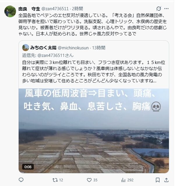 普通は正義漢、侠客が現れてもいいんだよ。英雄が待たれる。だがそんな人は日本中探してもいないんだ。被害に苦しむ人がいる。誰も助けない。さらなる再エネ推進という。電気はもういらないんだ。再エネは金儲けのダシよ。日本人がダメになりましたな。風力被害に反対も抗議もない。意思がない。だから「考える会」と云うんだろうね。すっかり闇の世界に管理されている。どこが民主主義だよ。