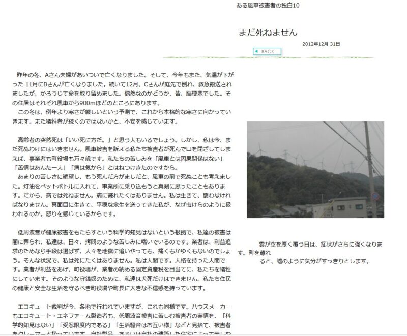 同級生とか、農協の役員とか、私とは違う交流の重さがあった。私は一人っきりだからね、今の人物破壊を聞いていると腰抜かすわ。それほど人々の憎しみが沸いている。風力の「フ」の字も言えないくせにさ。まるで催眠術をかけられたみたいに意思や思考のないロボットになっている。インプットされたセリフだけ。私の話は受け付けない。全国版で聞いているけど、私の悪口は各地で固定されているらしい。