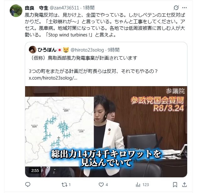 それでもXでは大層な視聴数になっている。政治やな。これまで議員が、政党が、何か風力被害に立ち向かった実績はない。由良町の風車被害なんかボロクソだったよ。いろんな小さな政党が、たまに風力発電に触れる。票稼ぎ、選挙言葉だ。とくにお花畑の面々には、いかにも大変な変化があるように吹聴するからね、煽りだと分かる。1日、経って分かることは、議員はカネと票だけだ。