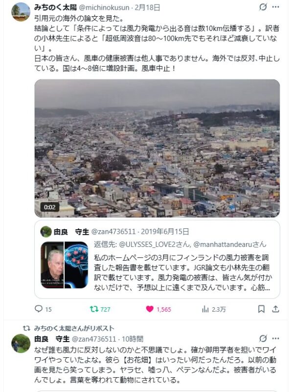 それは秋田でも北海道でも同じ被害状況だ。Xで、石狩の風力被害をアップした人には、「つわりでしょう」と揶揄する返信メールがあった。他にも虐待するメールがあるから組織的な弾圧があることが分かる。私もドッサリやられているから。風力に反対したらエライ目に遭わされる。それが人々には面白いのだ。自滅、自壊する社会の凋落よ。人間破壊、社会の根底を破壊する。地球温暖化防止だってか。