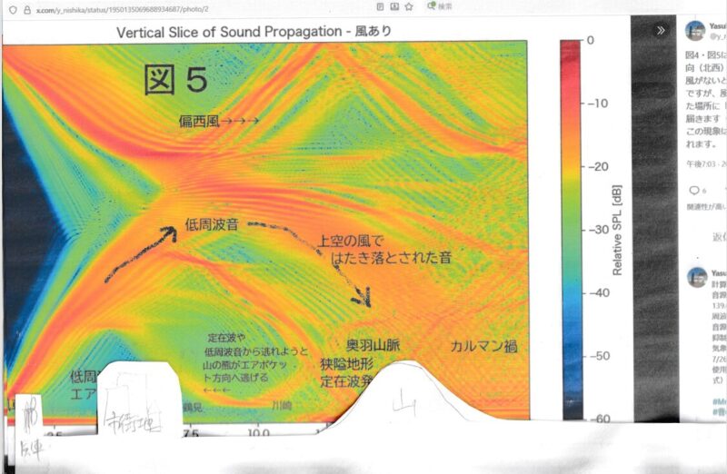図は、左に風車があって、市街地を超えて山地に到達する様子を実際のシミュレーションにしている。上空に反転層、反射して山々に響くのだ。(野外コンサートの音の広がりを示した図を転用したらしい)