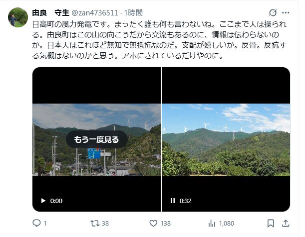 動物園みたいなものさ。御坊市、日高川沿いで風車群の動画を撮ってアップした。有田川沿いとはまた違った風土がある。有吉佐和子の小説『日高川』「有田川」を思い出す。『紀ノ川』はよかったのにね。誰も風力被害には触れないし、私を敬遠する。敵視する。人間はおらんのかい。スマホを持っている人もいるだろう。それでも見たらあかんのやで。【何も知りません】
