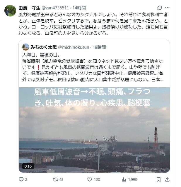 タブー視されているか。危険人物にされるから。インターネットを見て分かるように、サイトでも、Xでも、私一人が風力発電の被害を訴えている。各地でやっている「考える会」の正体が分かっただろう。いまだに「土砂崩れが心配だ」と扱いている。アホに付ける薬はない。風力人間だったのだ。その事を日本人たちは見ている。しかし意味が分からないのだ。なぜ土砂災害なのかも分からないままに時が過ぎていく。