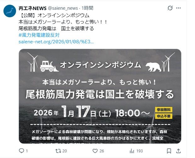 昨日のX記事では「尾根に風車を建てるな」とやっていた。そのメンバーは同じで「土砂崩れが心配です」と心理トリックを繰り返す輩だ。彼らのこれまで繰り返してきた嘘八百を見れば分かるじゃないか。懲りない奴らよ。カネ貰ってやっている。風力利権だ。全国大会だ、などと息巻いているけど、真実を見破る人はいくらでもいる。もう底は割れているのに、なぜそんなトリックをしてまでピエロを演じるのか。