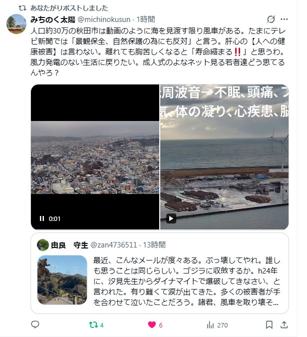 もちろん国道42号を通るドライバーにも悪い奴はいる。社会の崩壊だね。いや、私への破壊攻撃だと気が付く。X(twitter)でのフォロワーも1.3万人を超えて視聴者が格段に増えた。動画の再生が100万回を超える。由良町の風力被害が全国に発信される。低周波被害だけでなく、被害者に対する弾圧、私の四面楚歌、どれを取っても見所いっぱいだ。世界では、とうに風力反対が常識になっているのに、日本だけ、ペテンのエセ反対が跋扈する。